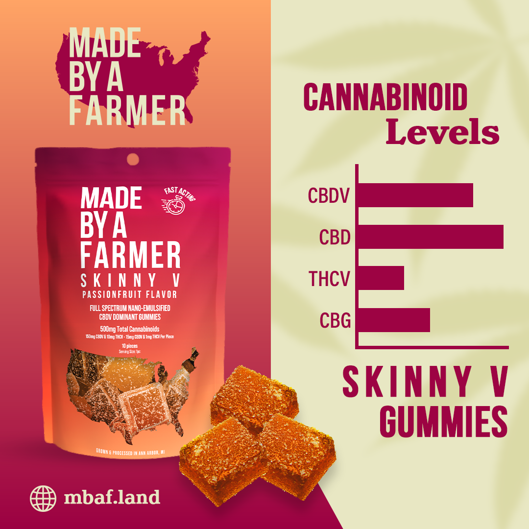 Sugar, Corn Syrup, Water, Cannabidivarin (CBDV) Distillate, Pectin, Citric Acid, Natural Flavors, Color (Vegetable Juice for Color, Tumeric, Maltodextrin).